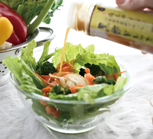 サラダにかければ、野菜の甘みと黒酢のまろやかさが広がり、自然の美味しさそのままの一皿をお楽しみいただけます。