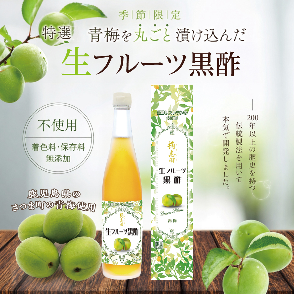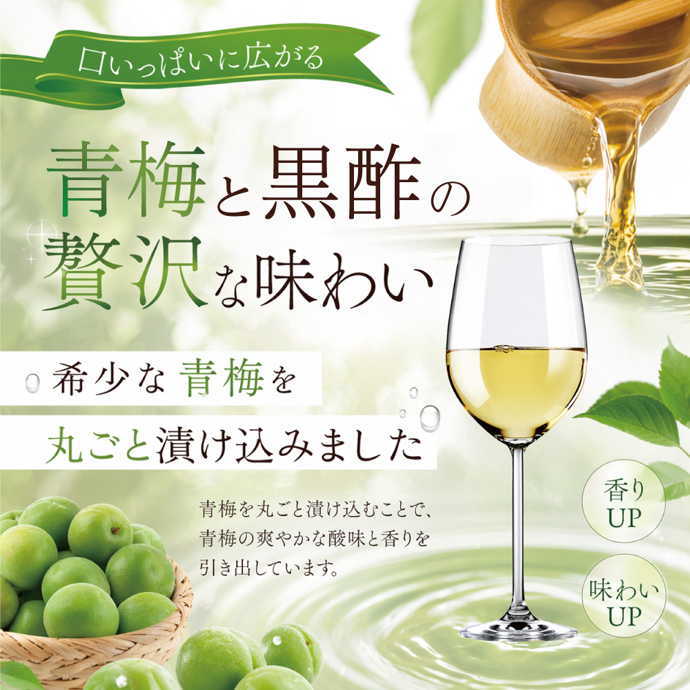 使用する青梅は、鹿児島県さつま町産。 アミノ酸を豊富に含む「玄米黒酢 桷志田」に、クエン酸たっぷりの青梅を丸ごと贅沢に漬け込み、 爽やかな香りとキリッとした酸味を引き出しました。