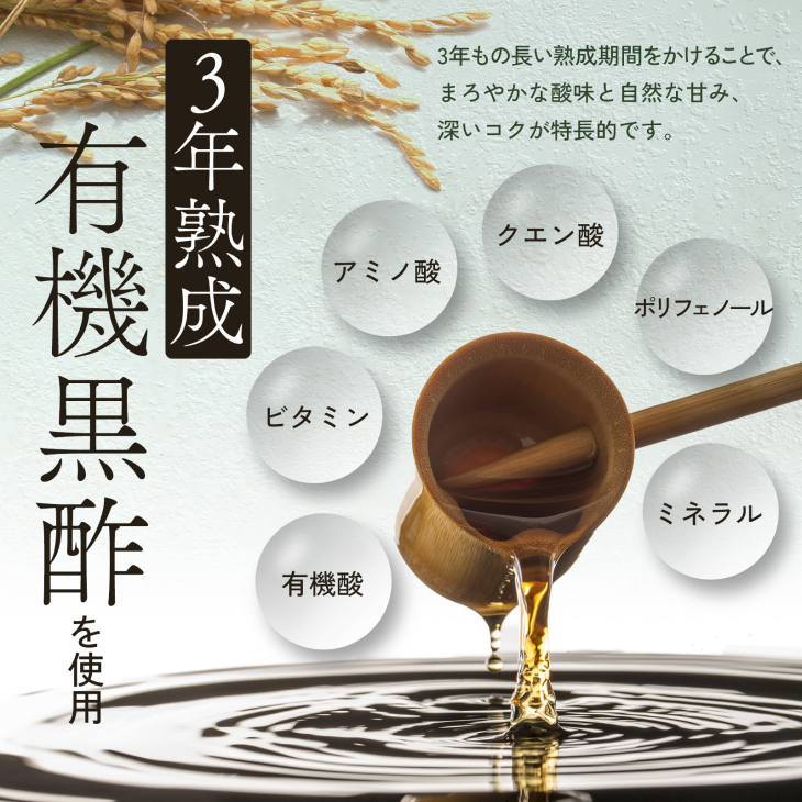 3年以上熟成の有機黒酢「桷志田」、有機醤油、種子島産粗糖、エクストラバージンオイル、グレープシードオイルなど、