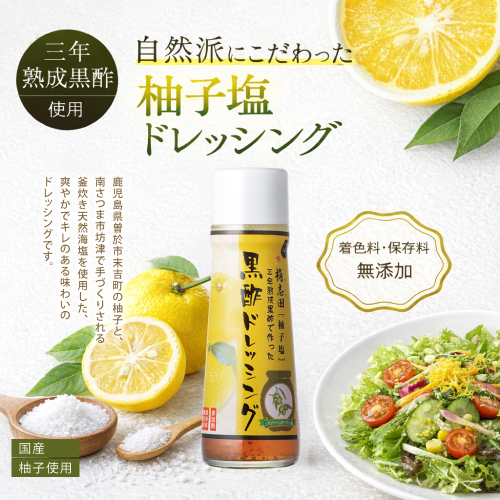 鹿児島県曽於市で“栽培期間中農薬不使用”のゆず果汁と、日本でも有数の透明度と美しさを誇り、サンゴ礁の生息地としても知られている、鹿児島県南さつま市坊津で手づくりされる釜炊き天然海塩を使った、香り豊かな柚子塩ドレッシング。