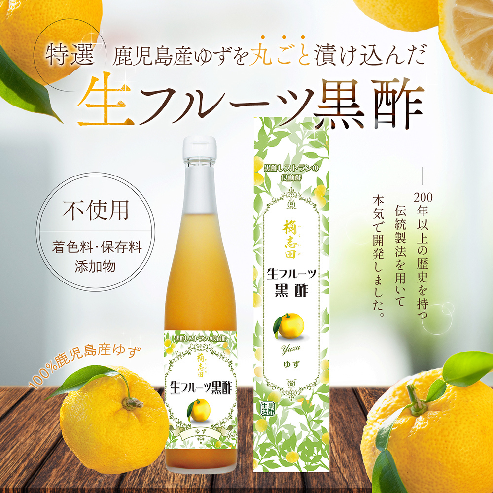 そのまま果汁も果皮もまるごと黒酢「桷志田」に漬け込み、ゆず本来の香りと軽やかな酸味を贅沢に引き出しました。