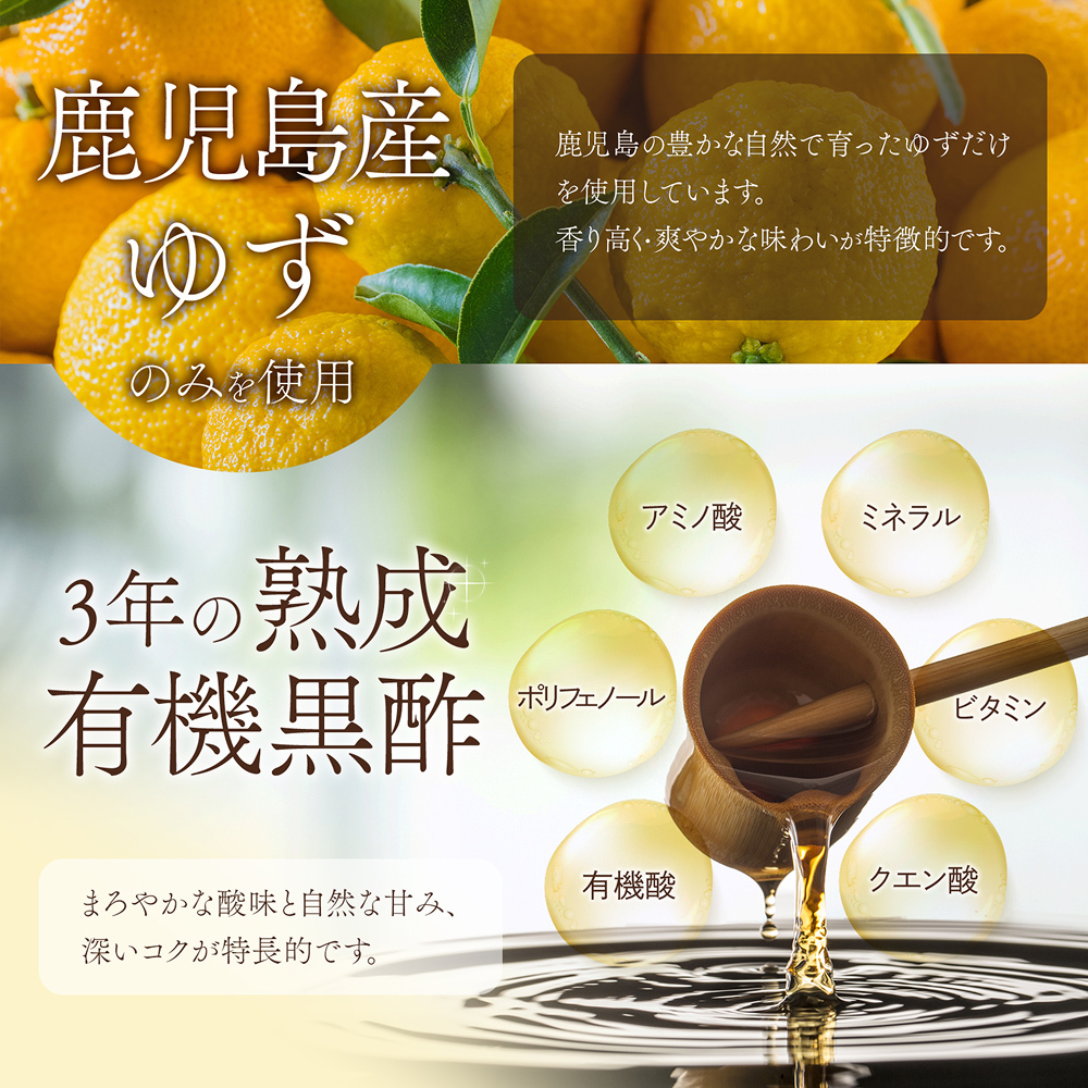 長期熟成黒酢の深みと、ゆずの清々しい香りが上品に重なり合う、冬だけの特別な味わいです。お水・炭酸割りはもちろん、ホットでの温かな一杯や、お鍋のつけだれ、さらにヨーグルトやアイスのデザートソースにも。ギフトにもふさわしい、素材を生かした贅沢な黒酢です。