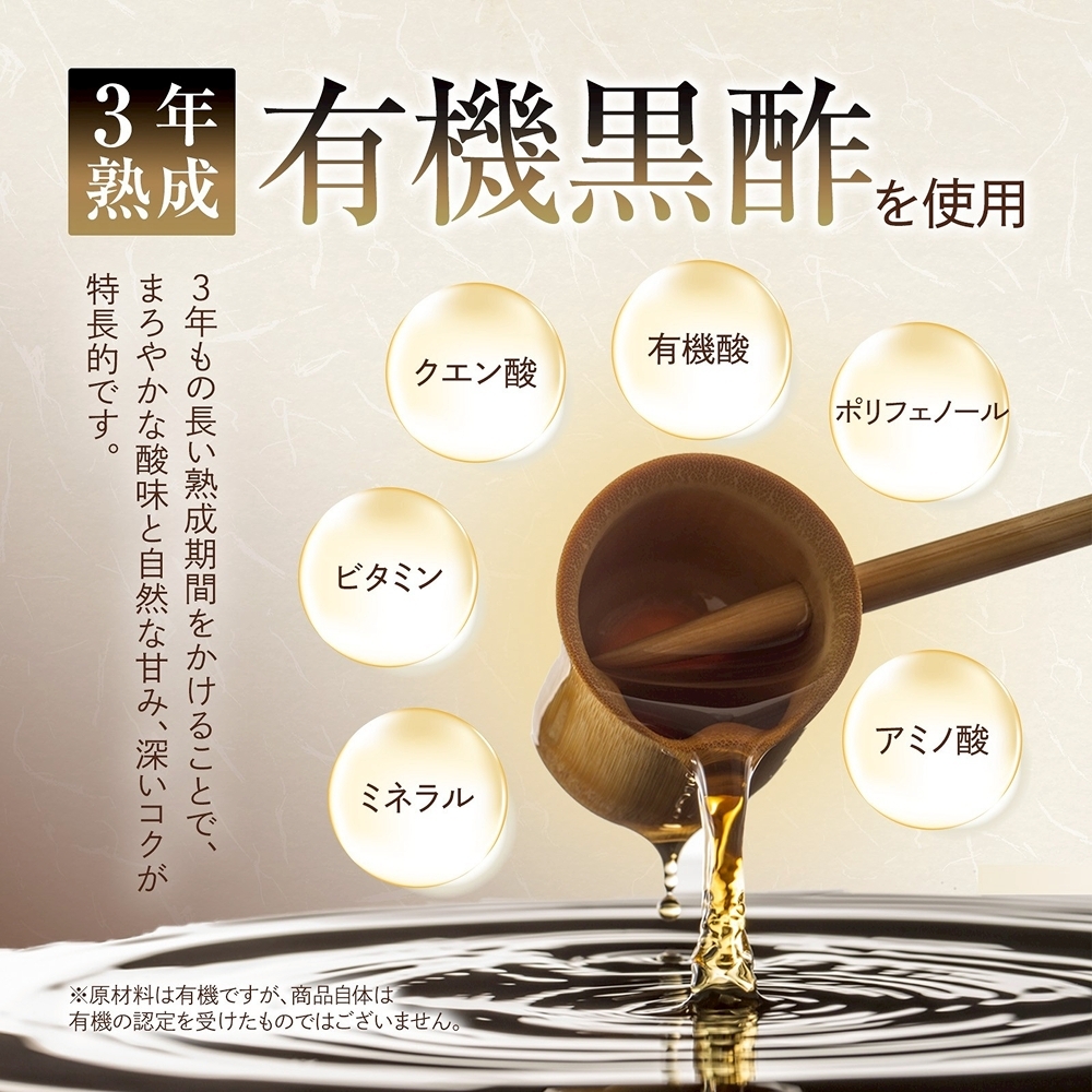 3年以上熟成の有機黒酢「桷志田」、玉ねぎ、米麹、豆鼓、粗糖、生姜、ニンニク、鷹の爪をベースに、黒豚特有の甘さとコクがプラス。