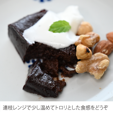 まるで生チョコのようなガトーショコラ!黒酢レストランの女性パティシエが試行錯誤を重ねて作り上げたケーキです。黒酢を入れることで濃厚なのに後味さわやか。冷やしてしっとり、あたためてトロトロ。2つの食感でお楽しみいただけます。